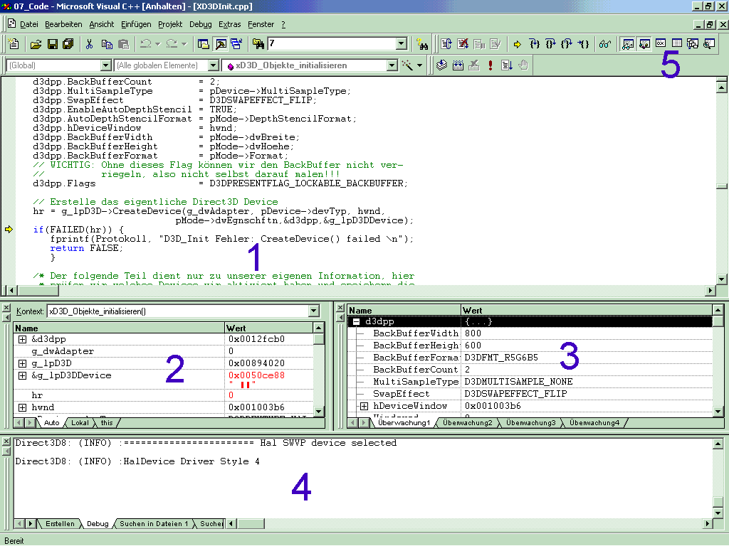 4 Debugger-Output. Hier schreibt DirectX und auch das eigene Programm Meldungen hin. Diese Liste ist auch nach Programmende noch vorhanden und wird erst beim nächsten Programmstart zurückgesetzt.