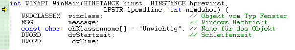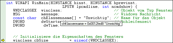 Den Inhalt initialisierter Variablen kann man sich anzeigen lassen indem man mit dem Cursor auf den Variablennamen zeigt, bei Arrays wird noch die Adresse angezeigt. Zu bemerken sei hier noch, daß der Debugger nur die Zeilen anspringt, die auch beim Compilieren und Linken zu ausführbarem Code geworden sind. So wurde die Zeile mit der Initialisierung von chKlassenname beim 2. Druck auf F10 angesprungen und erst danach wurde mit dem Cursor über dieser Variablen ihr Inhalt angezeigt.