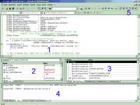 1 Quellcodebereich, hier können über ein Kontextmenu, das mit Rechtsklick auf eine Variable oder Zeile aufgerufen wird, Informationen zu Variablen abgerufen werden. Außerdem kann man hier die nächste Anweisung festlegen, so kann eine Zeile immer wieder abgearbeitet oder auch übersprungen werden. Netterweise lässt sich auch der Quellcode wärend der Laufzeit ändern, dazu wird vor dem Abarbeiten der nächsten Anweisung neu compiliert.