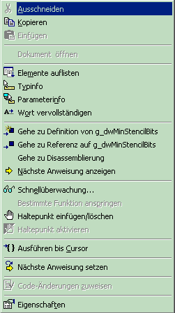 Wie bereits erwähnt sind Haltepunkte oft ein Problem wenn man DirectX debuggt. Hier hilft das Setzen mehrerer Haltepunkte(HP) um kritische Bereiche zu umgehen. Z.B. ist das Setzen des Videomodus und Lock/Unlock ein Problem, hat man einen HP danach, bleibt die Anwendung meist hängen und geht nicht zum Debugger zurück. Hier kann man einen HP vor diesem Bereich setzen, diesen dann im Einzelschritt(F10/F11) abarbeiten und danach mit F5 zum eigentlichen HP fortsetzen.