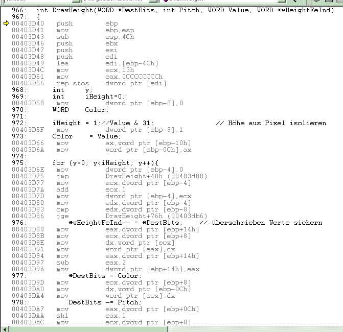 Wichtig: um eine Debug-Version seines Projektes zu erstellen muß man im Menu Erstellen->Aktive Konfiguration festlegen WIN32 Debug wählen! Wird dies vergessen, landet man nach F10 / F11 im Disassambliermodus in dem das Programm als Maschinencode(CPU-Befehle) angezeigt wird, und das ist recht selten eine Hilfe.