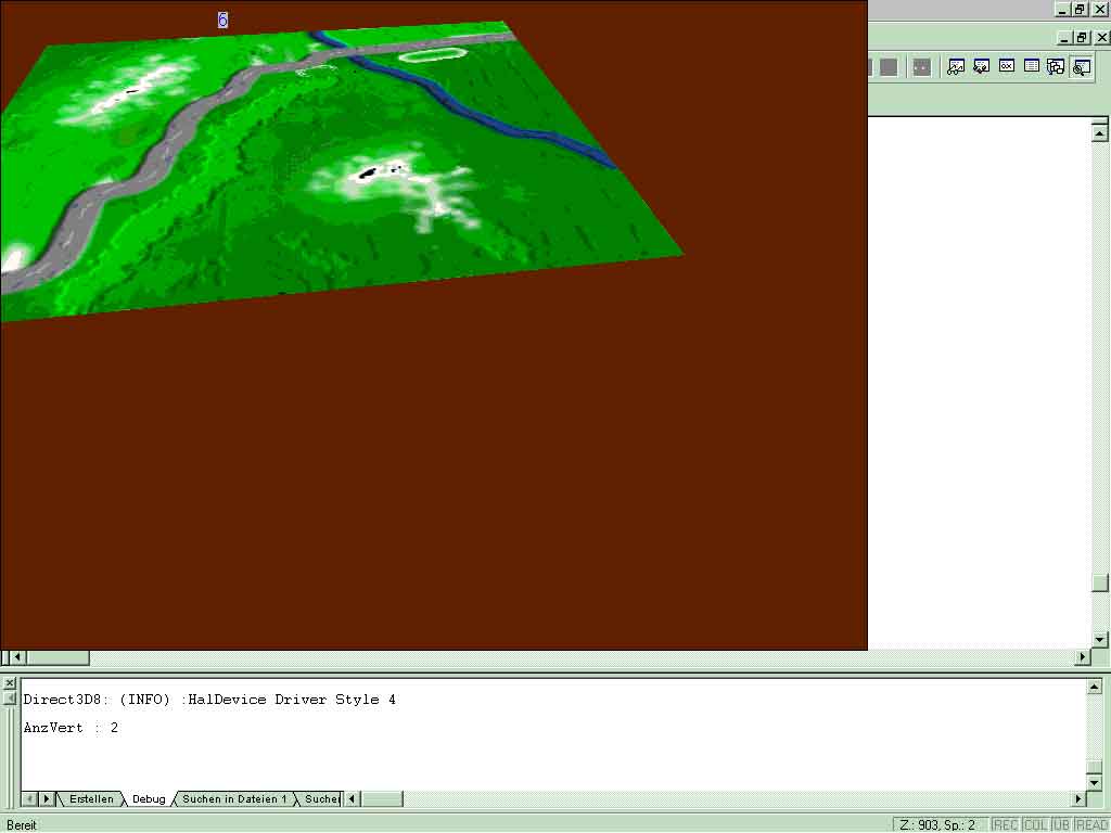 Um beiden Problemen weitestgehend aus dem Weg zu gehen, kann man die Anwendung auch in einem Fenster laufen lassen. Das bringt auch den Vorteil, das sich DirectX hier nicht exclusiv auf dem System breit macht und verhindert, daß man beim Wechseln zu anderen Anwendungen und zum Debugger auch was zu sehen bekommt. Hier muß aber die Farbeinstellung des Desktop mit der der Anwendung übereinstimmen. Außerdem empfielt es sich das Fenster der Anwendung mit CreateWindow auf die ürsprünglichem Vollbildmaße zu stellen. Dadurch hat die Anwendung trotzdem ihren vollen Bildschirm. Wenn die Dektopmaße größer sind kann man sogar noch auf das Debugfenster schauen.